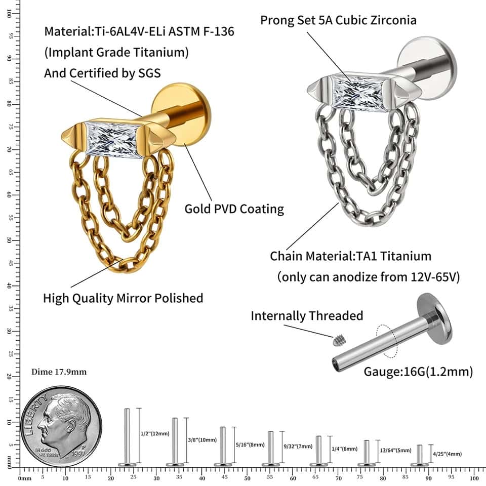 Ce labret en titane à double chaîne taille émeraude apportera un éclat luxueux à n'importe quel piercing ! La zircone cubique 5A, sertie sur griffes et recouverte d'un revêtement PVD doré, brille brillamment sur un titane poli miroir de haute qualité. De plus, ce labret est certifié de qualité implantaire, hypoallergénique et fileté intérieurement pour plus de confort et de durabilité.